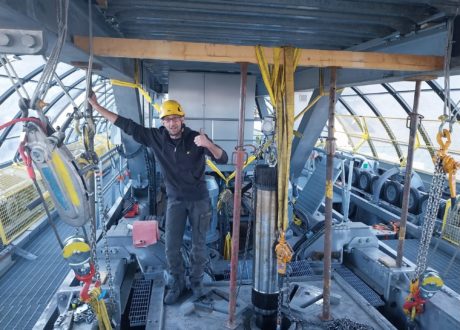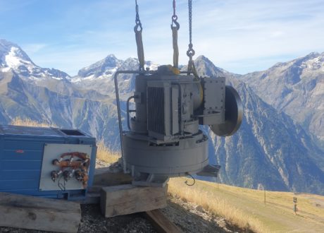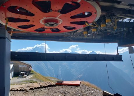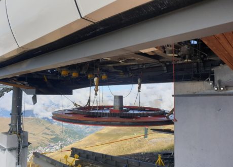 A quelques pas du 3S Jandri, grosses opérations de levage sur cette Gare MULTIX :dépose du moteur et du réducteur pour envoi en révision, reprise de tension, dépose de la poulie motrice et remplacement des roulements, remontage des ensembles, réglages et remise en route dans un planning SATA serré.
