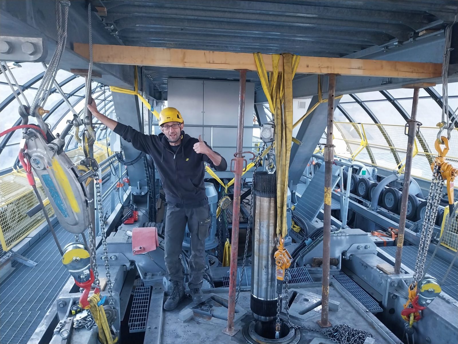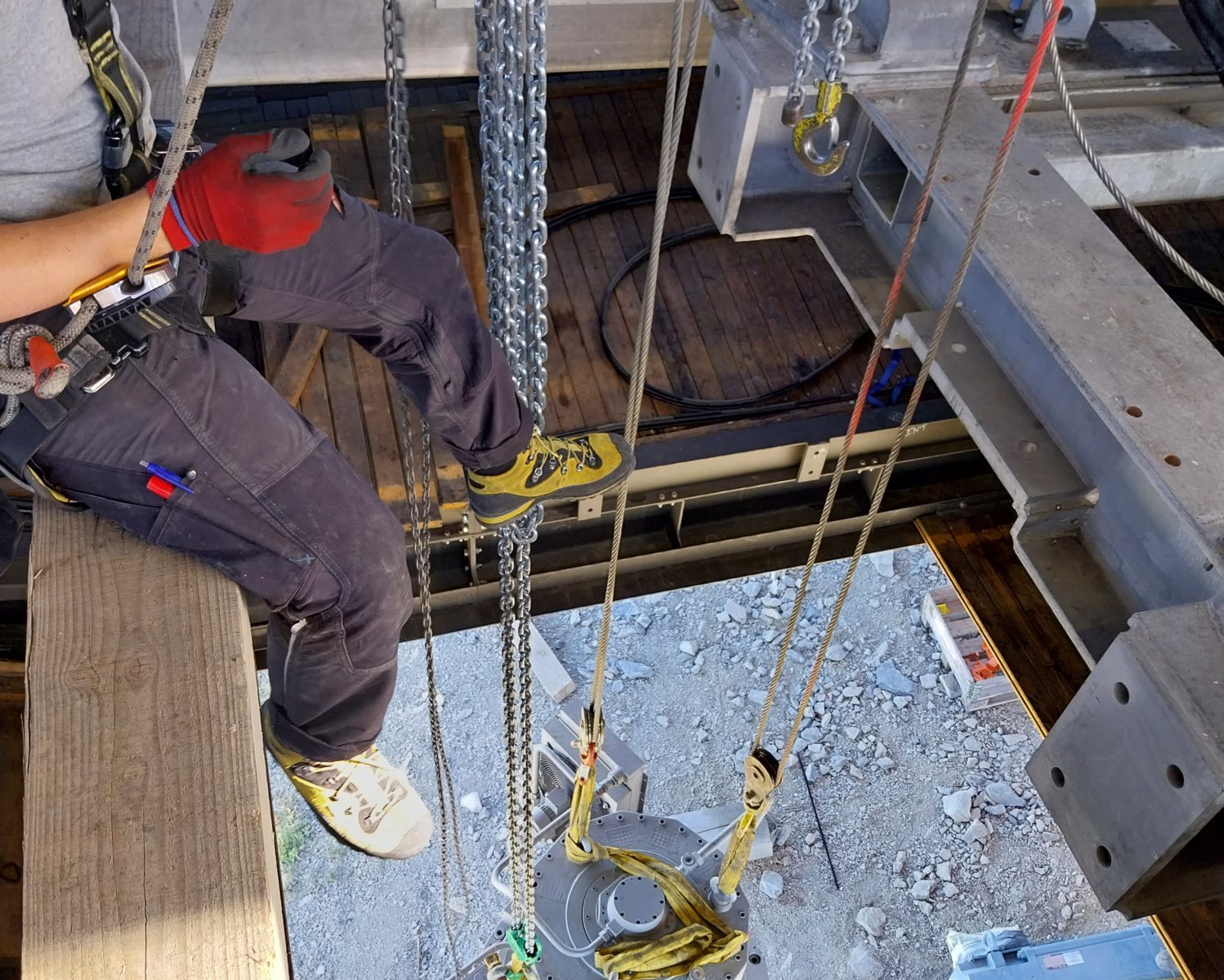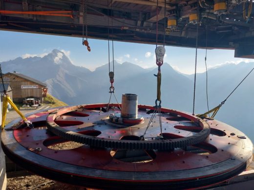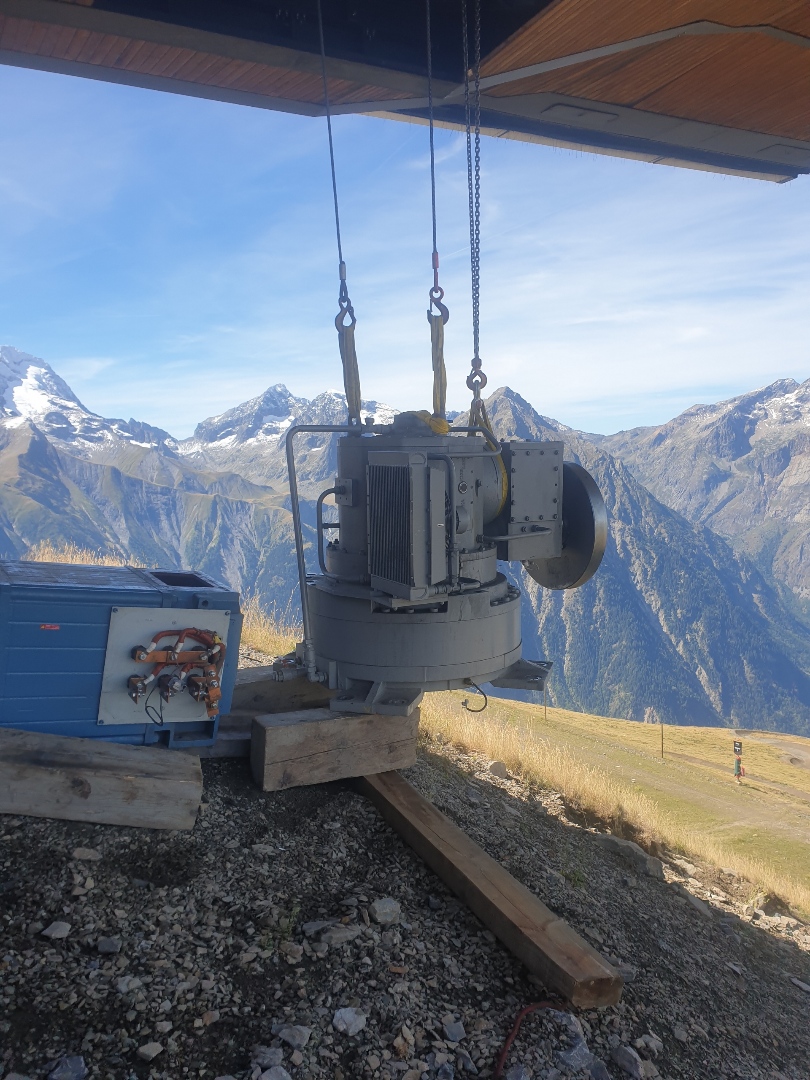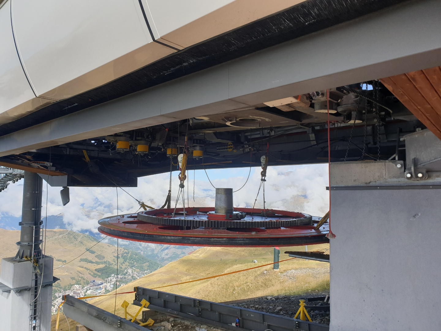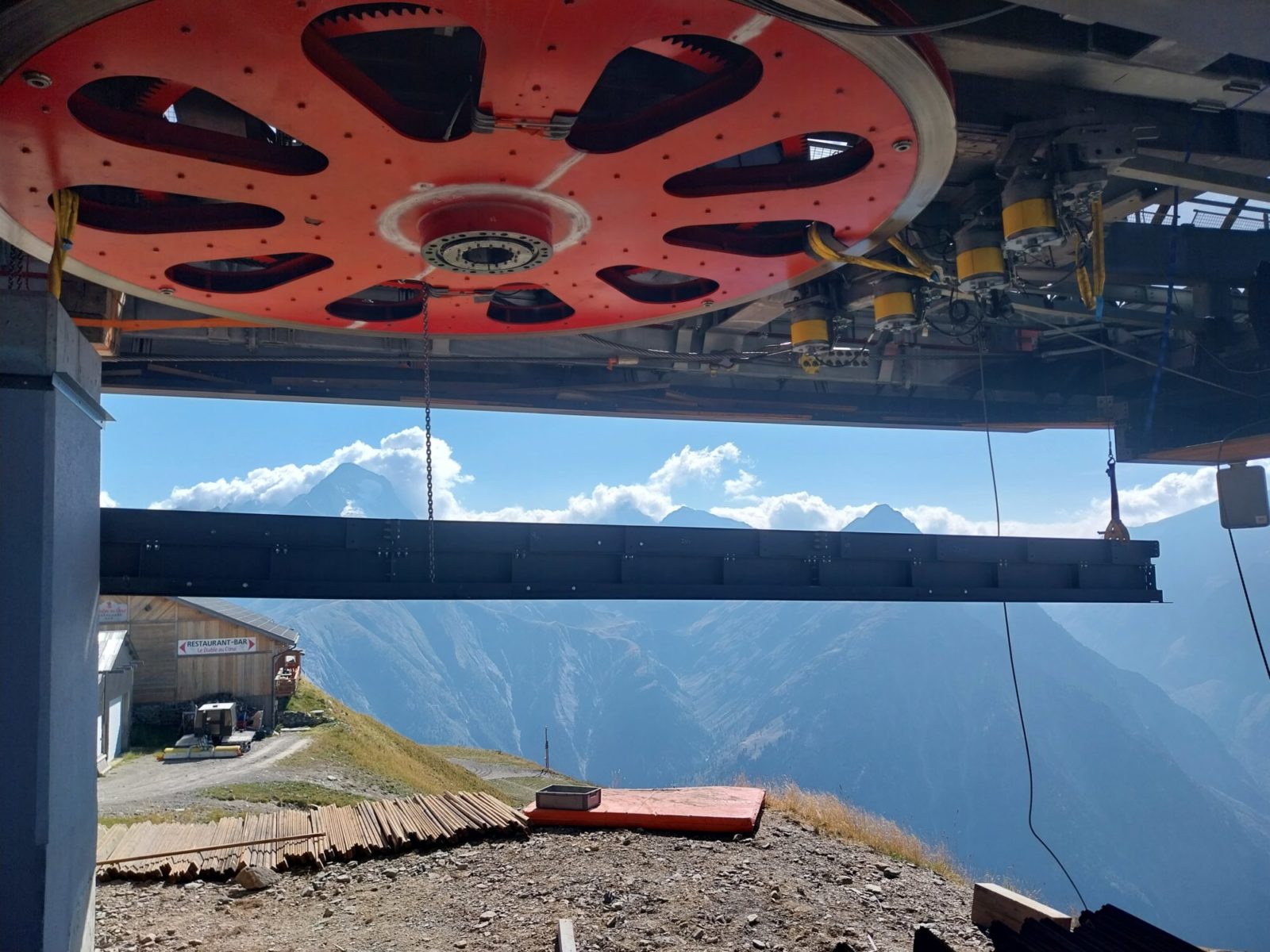 A quelques pas du 3S Jandri, grosses opérations de levage sur cette Gare MULTIX :dépose du moteur et du réducteur pour envoi en révision, reprise de tension, dépose de la poulie motrice et remplacement des roulements, remontage des ensembles, réglages et remise en route dans un planning SATA serré.
