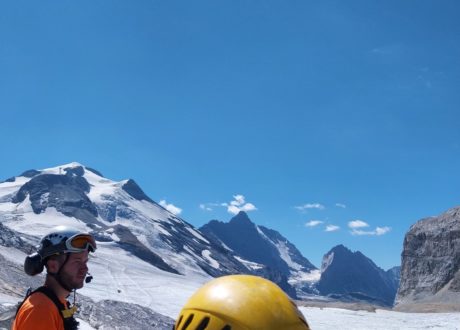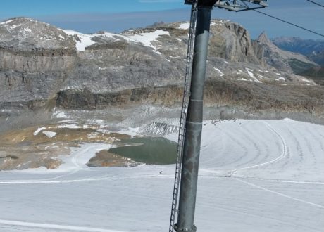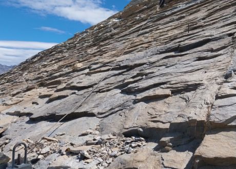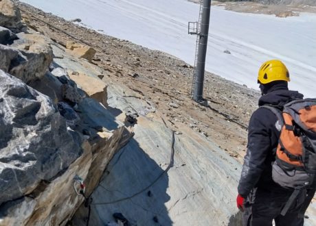 Merci à Jérémy et Davy pour la sécurisation des accès avant l’intervention des équipes sur la ligne qui nécessitait la pose de mains courantes sur ces dalles inclinées surplombant le glacier.