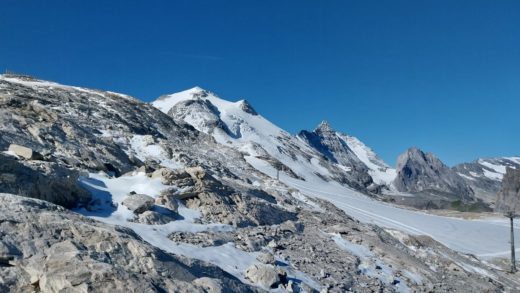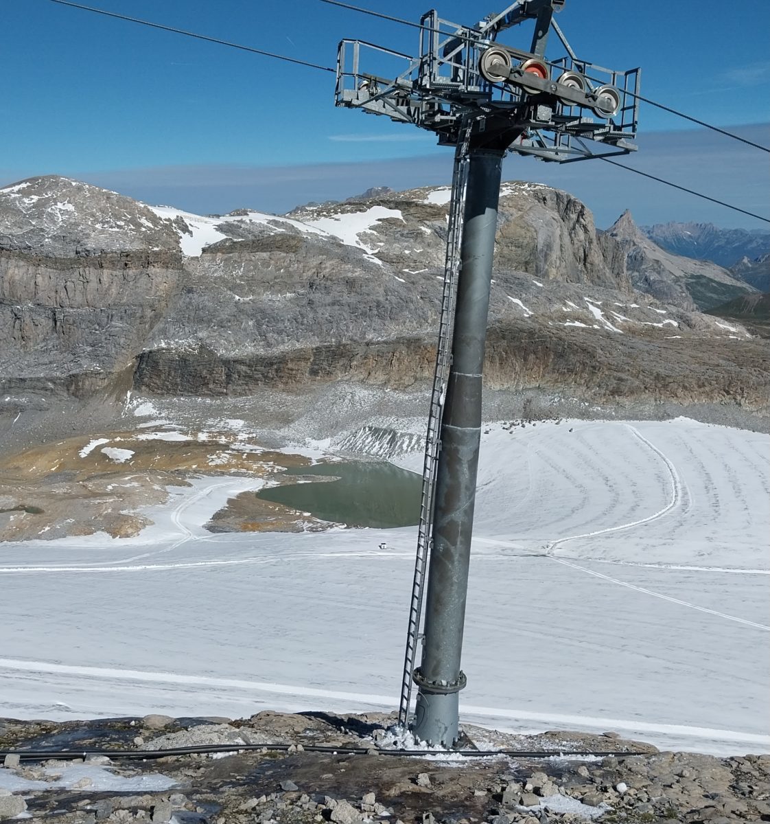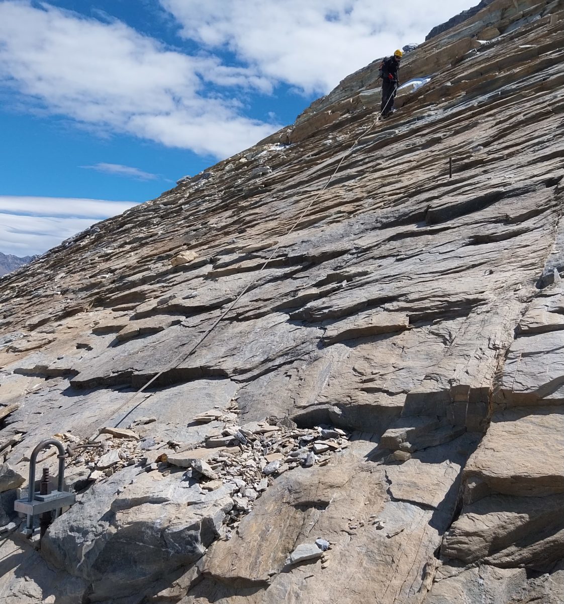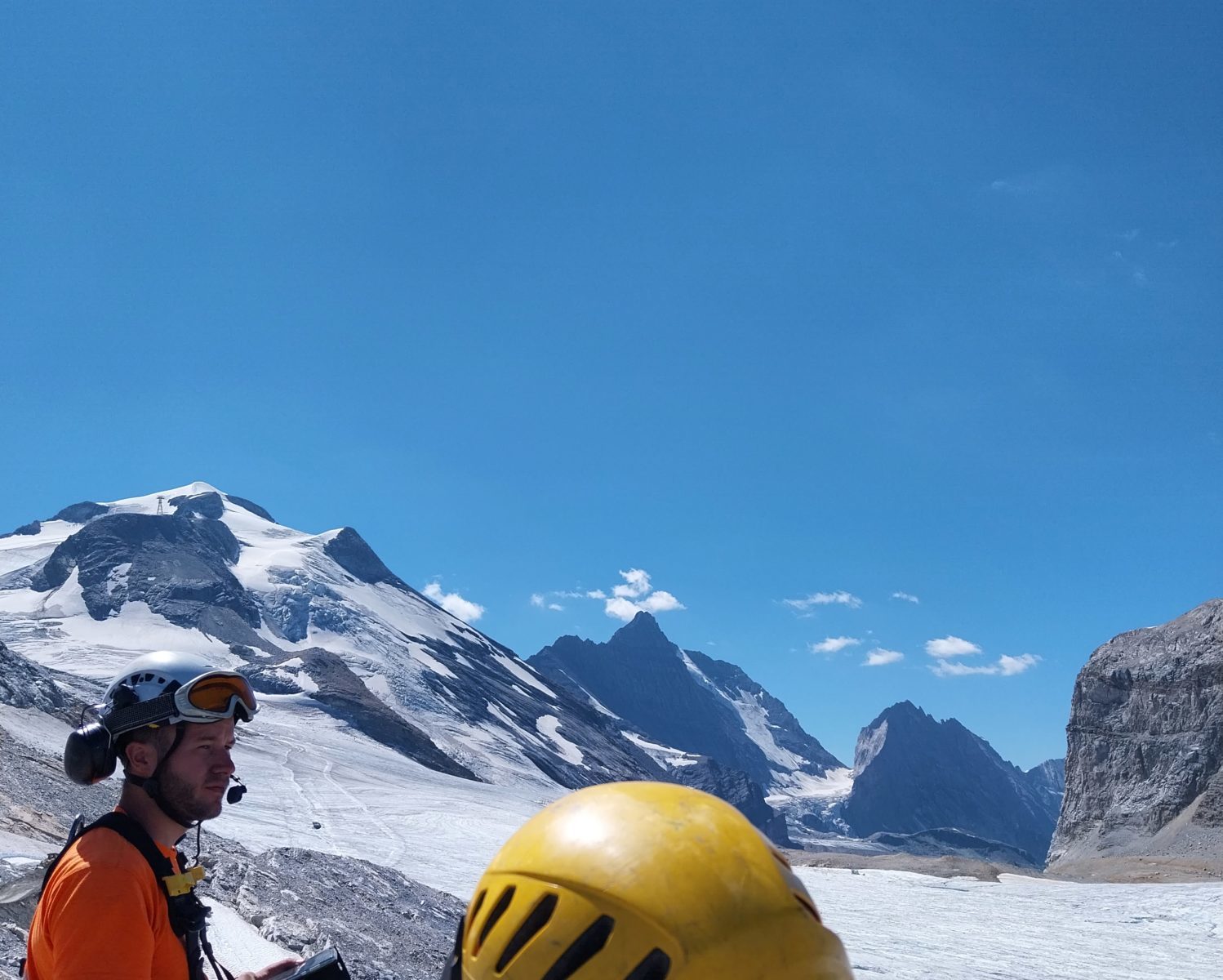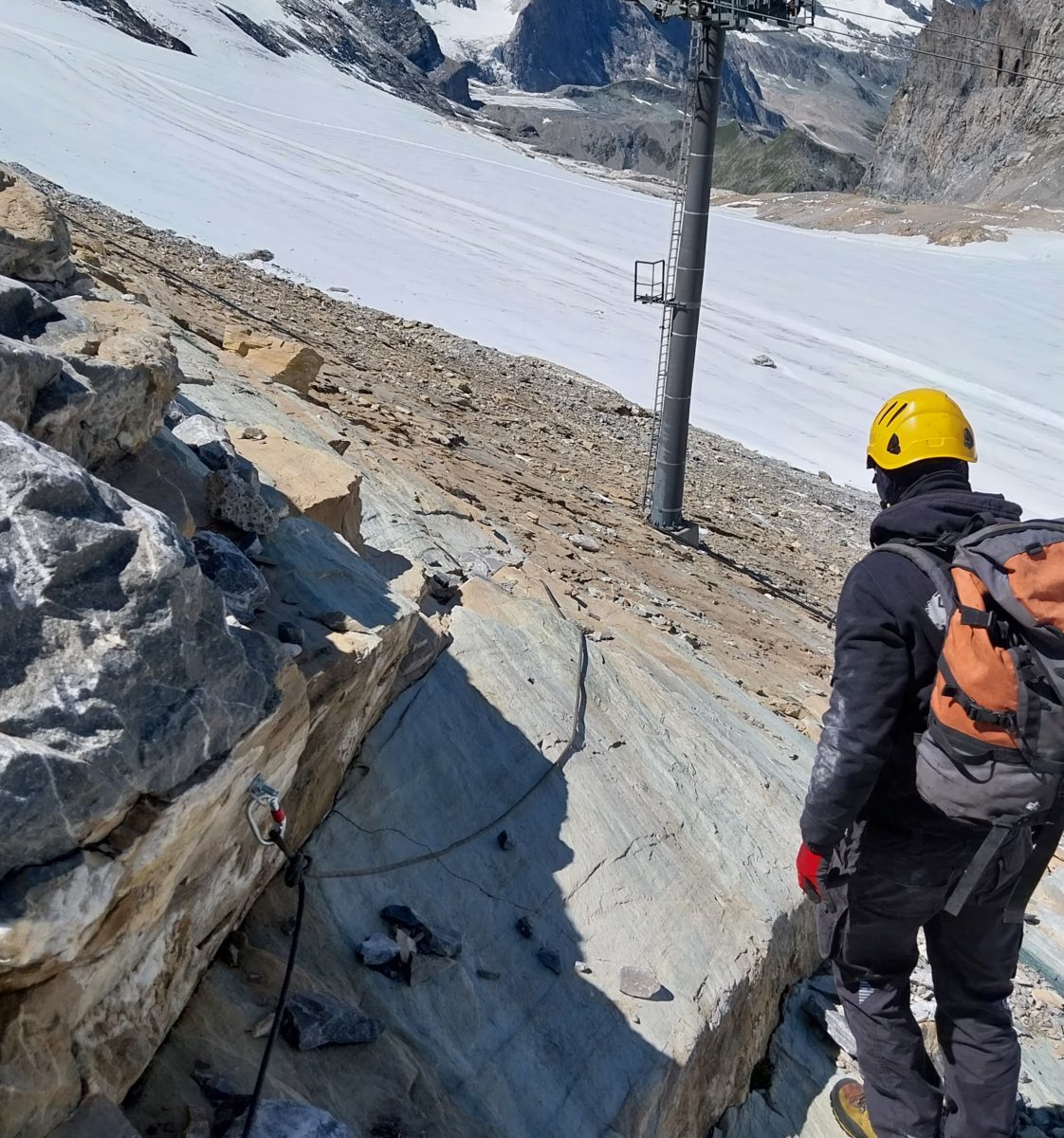 Merci à Jérémy et Davy pour la sécurisation des accès avant l’intervention des équipes sur la ligne qui nécessitait la pose de mains courantes sur ces dalles inclinées surplombant le glacier.